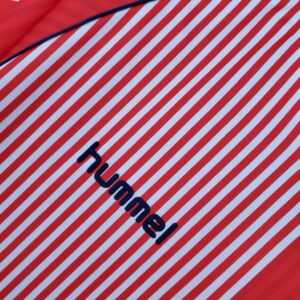 La camiseta de Dinamarca de 1986 es considerada una de las más icónicas en la historia del fútbol. Fue diseñada por Hummel y es famosa por su distintivo diseño dividido en dos mitades: una mitad roja y la otra con rayas blancas y rojas, que desde lejos parecía rosa. Además, las flechas características de Hummel en los hombros y el estilizado abejorro en el logo se destacaban en su diseño.